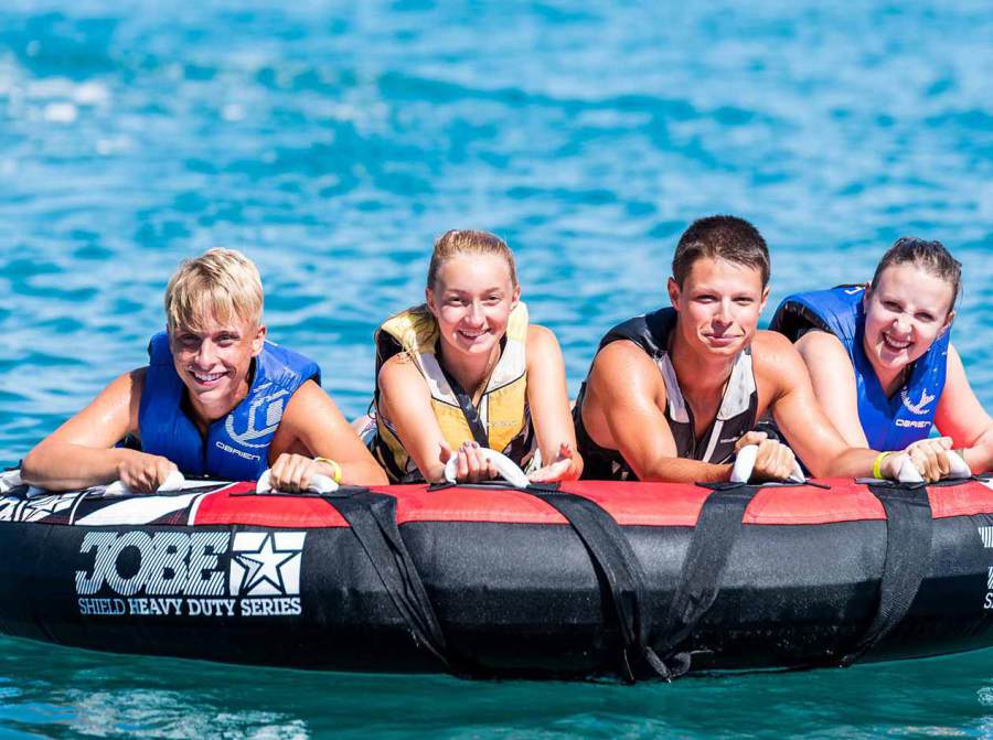 El programa semanal incluye: Una excursión de medio día, un día entero el fin de semana, una tarde de vela y, especialmente, actividades que van cambiando, como circuito de aventura entre los árboles, salto, Aquasplash, bolos, torneo deportivo, etc. El equipo de monitores, presente las 24 horas al día, los 7 días de la semana, también organiza juegos de piscina, anima actividades por las tardes, prepara espectáculos y garantiza la supervisión en la playa.