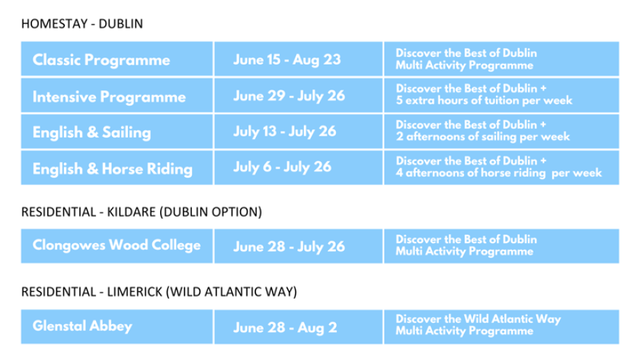 LINSTART Campamentos de Verano en Irlanda ofrece programas de inglés y multiactividades para jóvenes de 11 a 17 años. Los programas combinan clases de inglés por la mañana con diversas actividades culturales, deportivas y excursiones en el pueblo costero precioso y a solo 22 minutos Dublín.